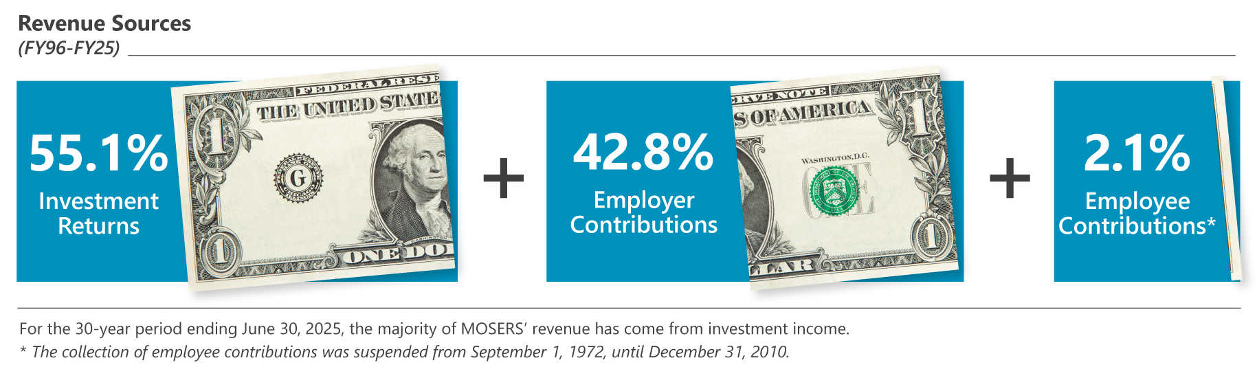 Only a portion of the entire cost of pensions comes from the state. Employees also contribute, through a required payroll deduction, toward their future retirement income. MOSERS investment staff use the employer and employee contributions to generate the largest source of System funding: investment income.